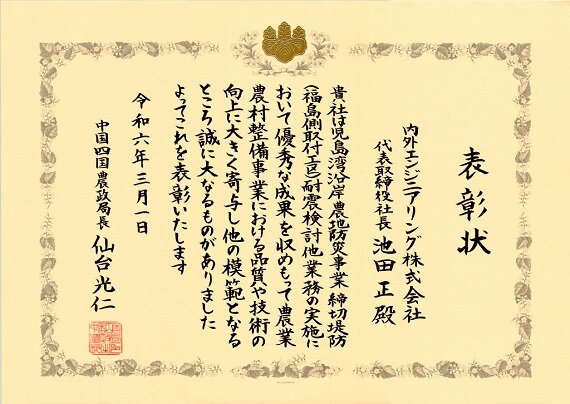 この度、令和5年度中国四国農政局所管農業農村整備事業等優良工事等の表彰において当社が実施した下記業務が優良と認められ、令和6年3月1日に表彰されました。