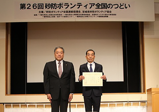 当社西日本営業部の千阪貞昭が、「第26回 砂防ボランティア全国のつどい」において、砂防ボランティア全国連絡協議会功労者表彰受賞し、6月10日に表彰されました。