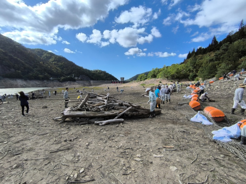 | 活動概要 | 永源寺ダムは琵琶湖東部愛知川沿岸の扇状地に拡がる約6,900haの水田地帯の主水源となっていますが、毎年、ダム湖内に大木等が流入し、ダムの重要な施設を損傷する恐れがあり、それらを防止するために、また、ダムの景観を保全するために、水位を落としたダム湖岸に漂着している流木の収集・処理等を行いました。 |