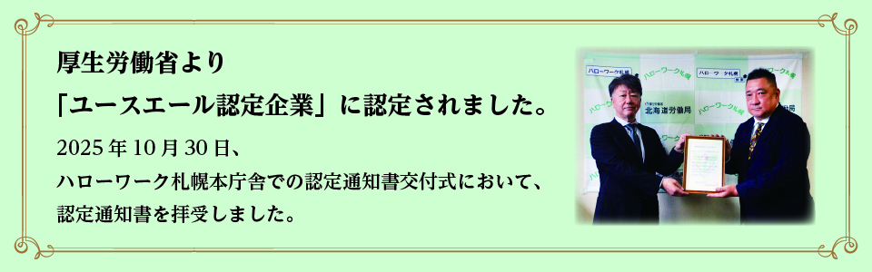厚生労働省より「ユースエール認定企業」に認定されました
