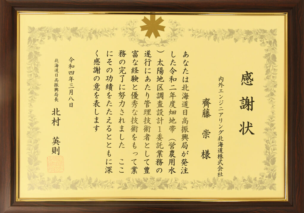 北海道日高振興局より、「令和3年 日高振興局産業振興部委託業務に係る優秀管理技術者」に、当社技術部プロジェクトリーダーの齊藤 崇が選ばれ、感謝状をいただきました。
