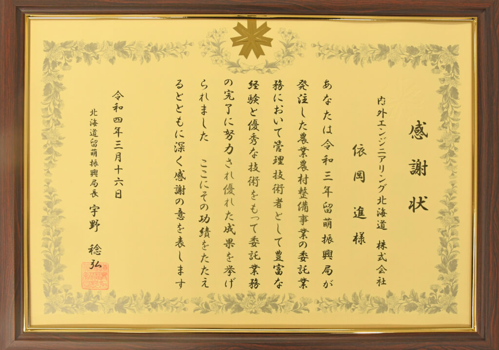 北海道留萌振興局より、「令和3年 留萌振興局産業振興部委託業務に係る優秀管理技術者」に、当社技術部アシスタントマネージャーの依岡 進が選ばれ、感謝状をいただきました。