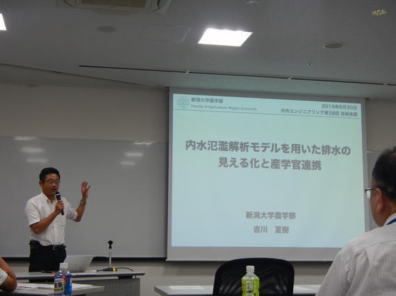 【新潟大学 農学部(自然科学系農学系列) 農業水利学研究室 准教授 吉川 夏樹様】をお迎えし、「我が国最大級のグリーンインフラ「水田」による水害の抑制」と「内水氾濫解析モデルを用いた排水の見える化と産学官連携」について講演して頂きました。