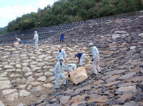 蔵王ダムは国営日野川農業水利事業で造成された中心遮水ゾーン型ロックフィルダムで日野川流域農地の主水源のひとつです。今般、地下水涵養や洪水防止機能等の多面的機能を持つ本ダムにおいて、グラウンドワークとして地域住民・企業・行政が協働して行う保全活動(除草、ゴミ拾い作業)に参加しました。 |