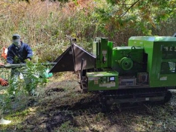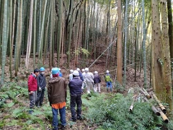 国営東播用水地区の上流に位置し、当地区の水源地である兵庫県篠山市西谷地区の山林を保全するため、昨年に引き続き植林地内の竹侵入対策として伐採等の保全活動に参加しました。 安全のためNPO法人バイオマス丹波篠山の方々の指導を受けながら、大きくなった孟宗竹の伐採、引き出し、搬出(粉砕)などを行いました。 | |
