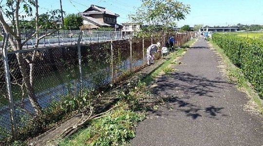 明治用水は矢作川を水源として明治頭首工によって取水、安城市を中心に8市にまたがる矢作川右岸約4800haの農地をかんがいしています。今般、頭首工から数キロ下流地点の明治本流水路右岸フェンス沿いの除草・清掃活動に参加しました。 |