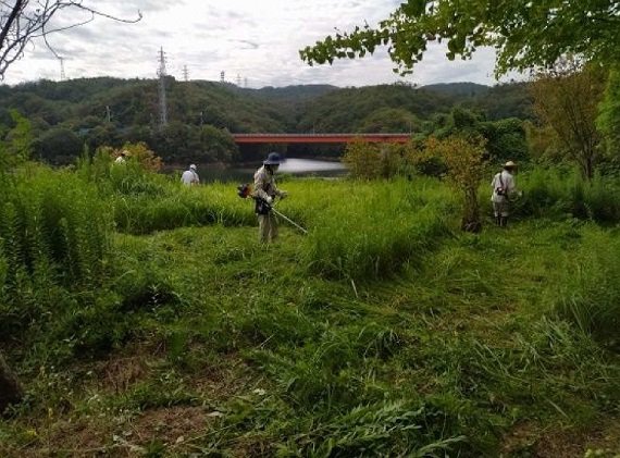 呑吐ダムは国営東播用水農業水利事業(S45~H4))により造成されたかんがいと上水を目的としたダムであり、上流の大川瀬ダム、川代ダムと導水路でつながり約7300haの農地の主水源のひとつとなっています。今般、ダム右岸部にある桜の広場及び道路周辺の草刈り作業等に参加しました。 |