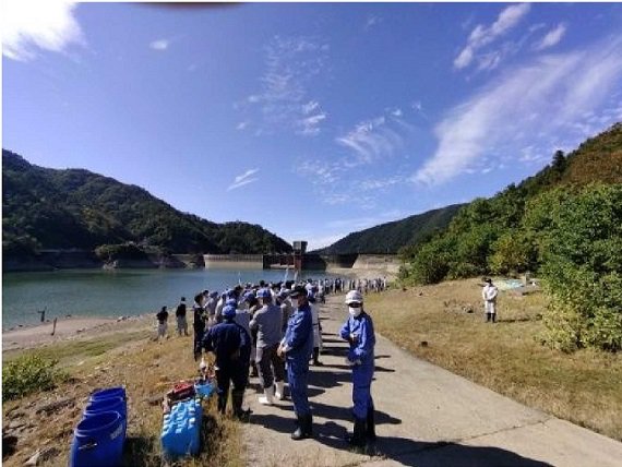 永源寺ダムは琵琶湖東部愛知川沿岸の扇状地に拡がる約6,900haの水田地帯の主水源となっています。今般、水位を落としたダム湖岸に漂着している流木の収集・処理等の美化作業に参加しました。 |