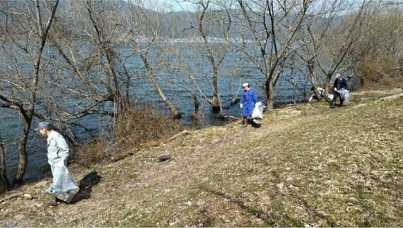 湖北地区は滋賀県北東部に位置する長浜市の約4,500ha の水田地帯です。本活動は地区の農業用水水源地として重要な役割を果たしている余呉湖および周辺をきれいにし、流域住民が一体となって美しい湖を守ることを目的として実施されるもので、余呉湖沿線道路、余呉湖岸のゴミ(紙くず、プラスチック、空き缶など)を拾い集めながら半周しました。 |
