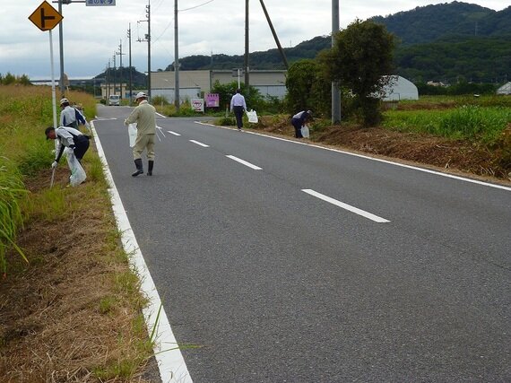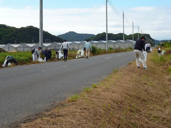 ○笠岡湾干拓地はS41~H元年度に876haの畑が造成され、野菜栽培や酪農・畜産が営まれているだけでなく、公園や道の駅などが整備され地域の方々に親しまれています。今回の清掃活動は、翌週10月13日(日)に開催される「べいふぁーむ駅伝」を前に、土地改良区を始め、行政、企業、NPO等が協働して干拓地の美化を図り、選手や観客の皆様方を気持ちよくお迎えするための活動で、今回で16回目になります。 |