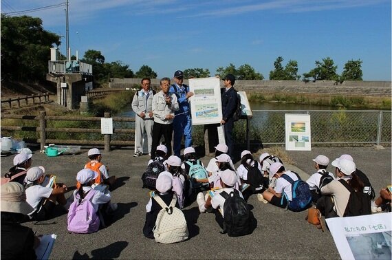 ○児島湾七区土地改良区では、岡山市立七区小学校4年生の児童を対象に干拓の歴史を学んでもらうとともに、児童たちが住んでいる七区地区の知識を深めてもらうことを目的とした「出前授業(土地改良施設見学会)」をNPOと連携して毎年実施しています。 |
