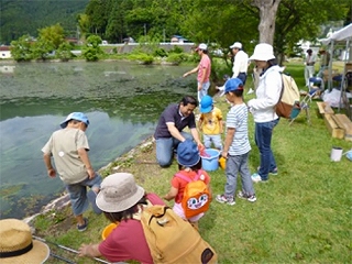 余呉湖の生態系を保全するために外来魚を釣り上げて駆除する