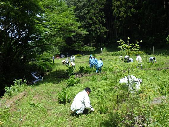 御前山ビオトープに移植した希少植物は順調に生育していますが、他の野草に負けないよう適正に管理(順応的管理)する必要があります。また、山桜等の植樹や老朽化した施設の補修をボランティア作業で行います。 |